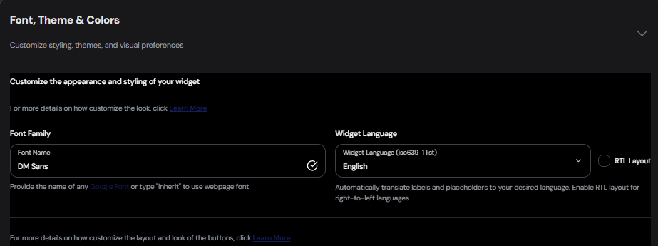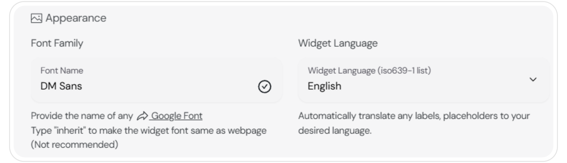 Inherit Font: Type “inherit” in the font input field to use the same font as webpage. Note: The widget must be put on the website for this to work.