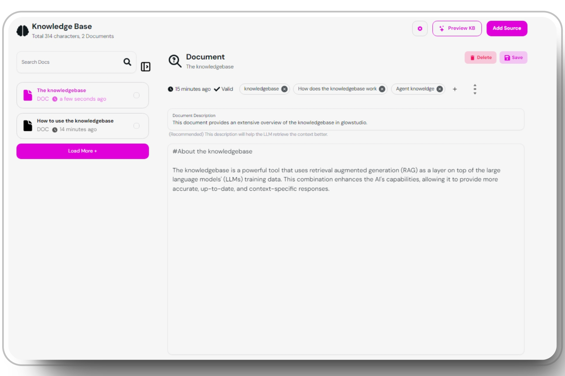 A Knowledge Base is a repository of information that your AI agents use to retrieve accurate and relevant responses to user queries. This repository can include documents, FAQs, manuals, and other structured data. The system utilizes retrieval augmented generation (RAG), which extracts information from a vector database. Want to learn more? Check this article: HereEnhanced Accuracy