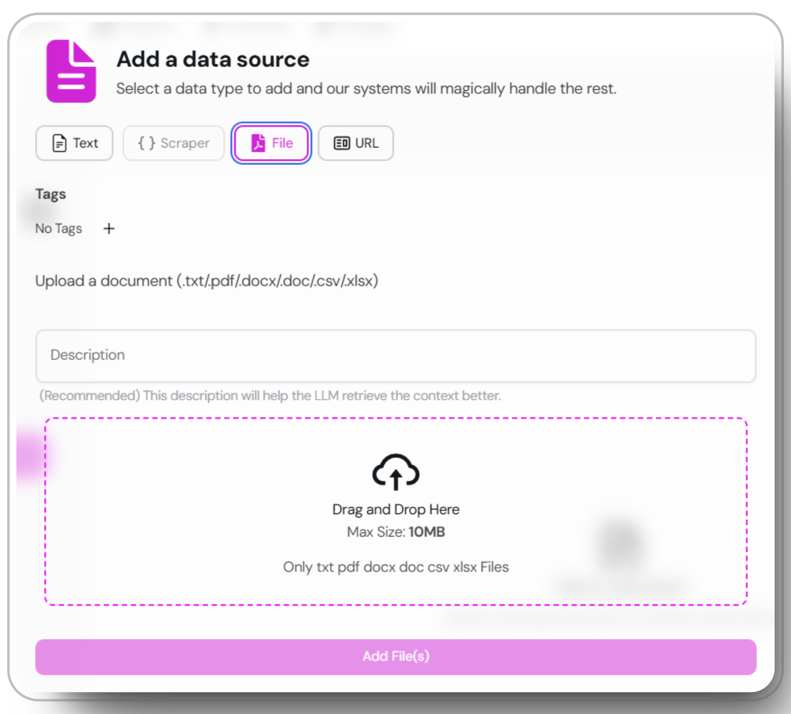 Select the documents you want to upload from your local system. Supported formats include .txt, .pdf, .docx, .doc, .csv, and .xlsx.