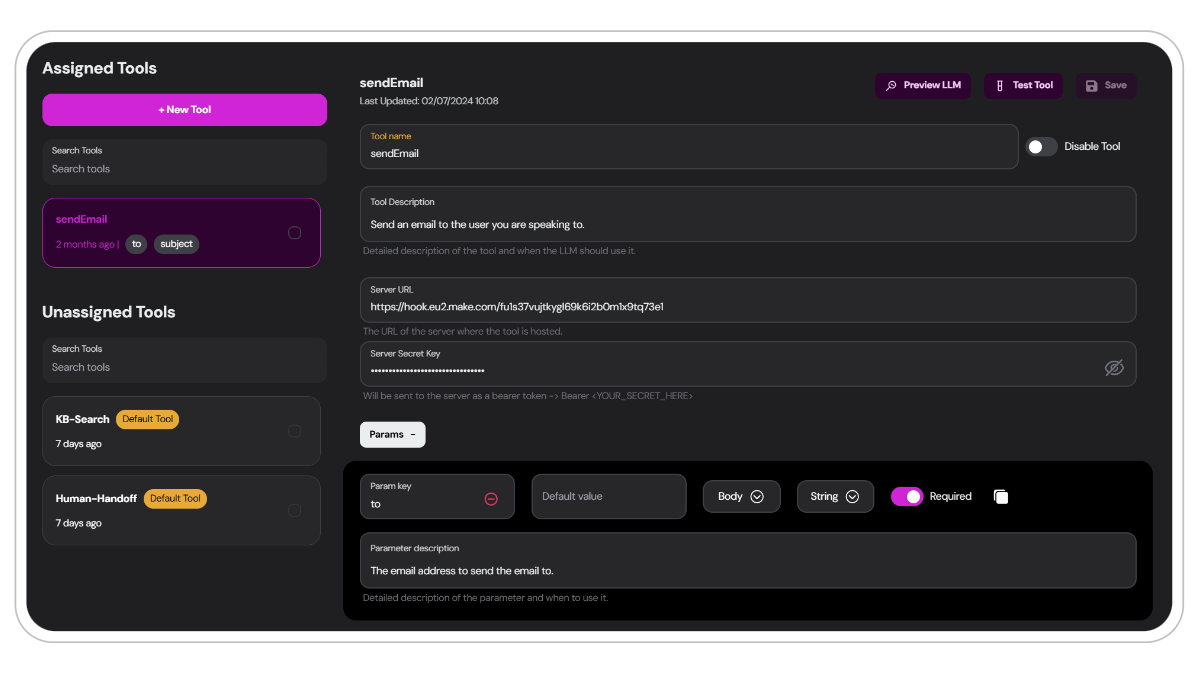 Tools, also known as , are custom capabilities that you can add to your AI agents. They allow your agents to perform specific actions or retrieve information from external sources, greatly enhancing their functionality and usefulness.Convocore sends parameters as a JSON array to your specified endpoint, enabling seamless integration with a wide range of automation platforms and servers. This flexibility allows you to create powerful, custom interactions between your AI agents and external systems.