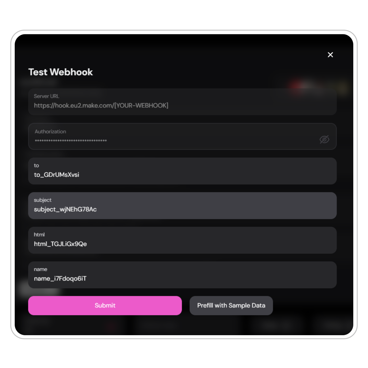 Find the endpoint URL from where your tool is hosted. In Make.com this is found by going to the webhooks tab and selecting your chosen endpoint.Then Copy the Webhook URL, looks like this: https://hook.eu2.make.com/fws5j13b27tq93nrpfjeowejrpwewfj
