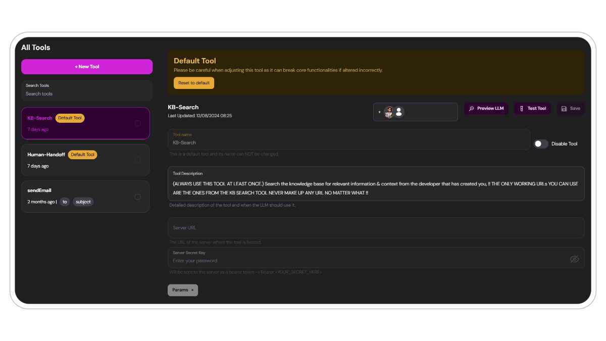 Convocore offers a powerful “Preview LLM” feature for thorough tool testing before deployment.1