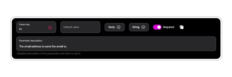 The name of the parameter (e.g., “to”, “subject”, “html”). Make this short and descriptive, this makes it easier for the LLM to interpret.