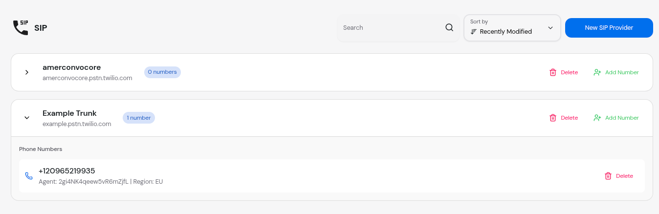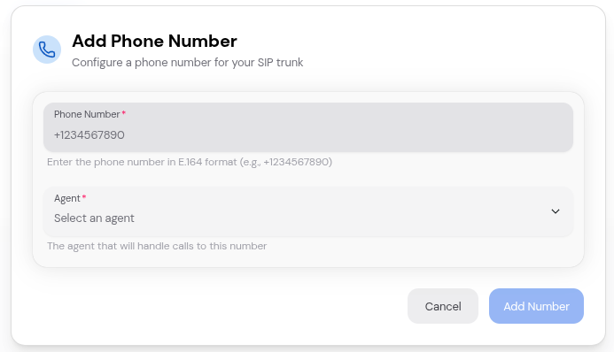 Once your SIP provider is configured, you can add phone numbers and map them to AI agents.1