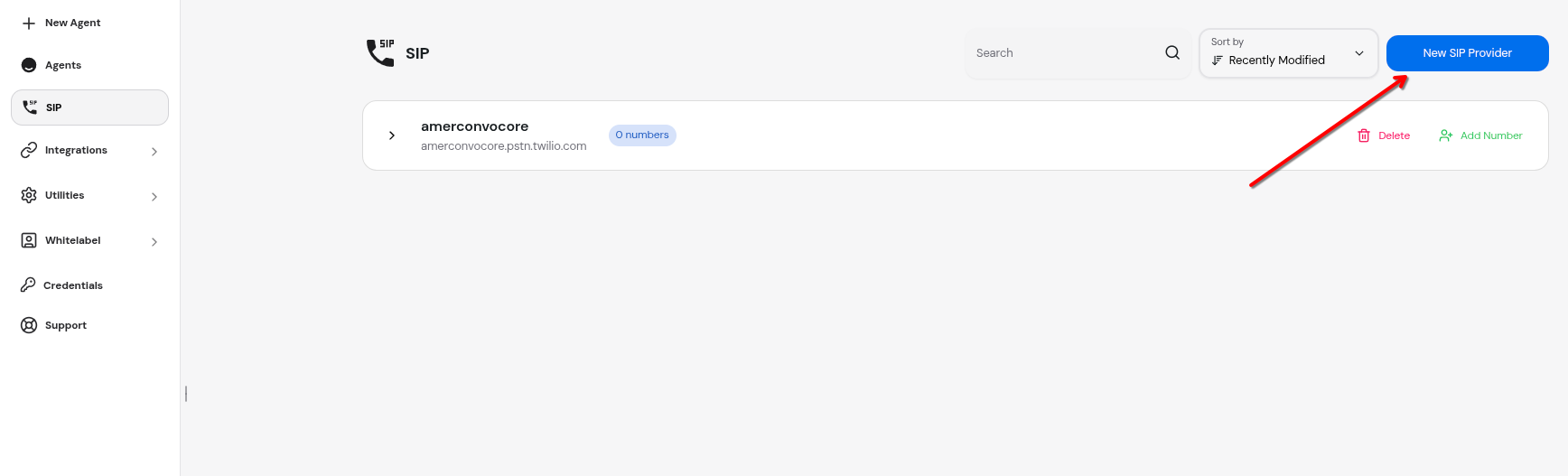 On the SIP management page, click the ”+ New SIP Provider” button in the top right