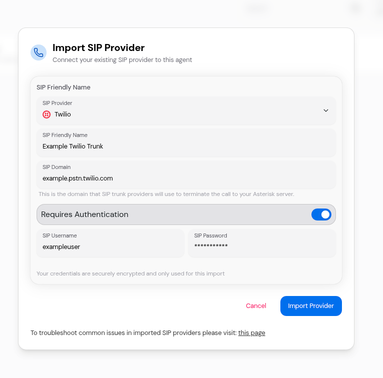 Here’s a sample configuration for a typical SIP provider:Your SIP credentials are securely encrypted and stored. They are only used to authenticate with your SIP provider.