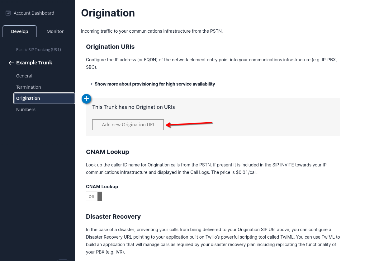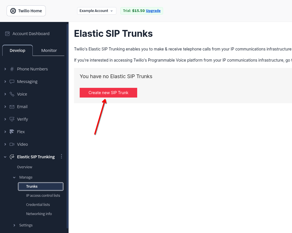 Navigate to Elastic SIP Trunking → Trunks → Create new SIP Trunk