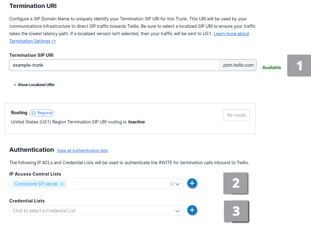 Configure the termination URI as this will be used to route calls to the Convocore SIP server: