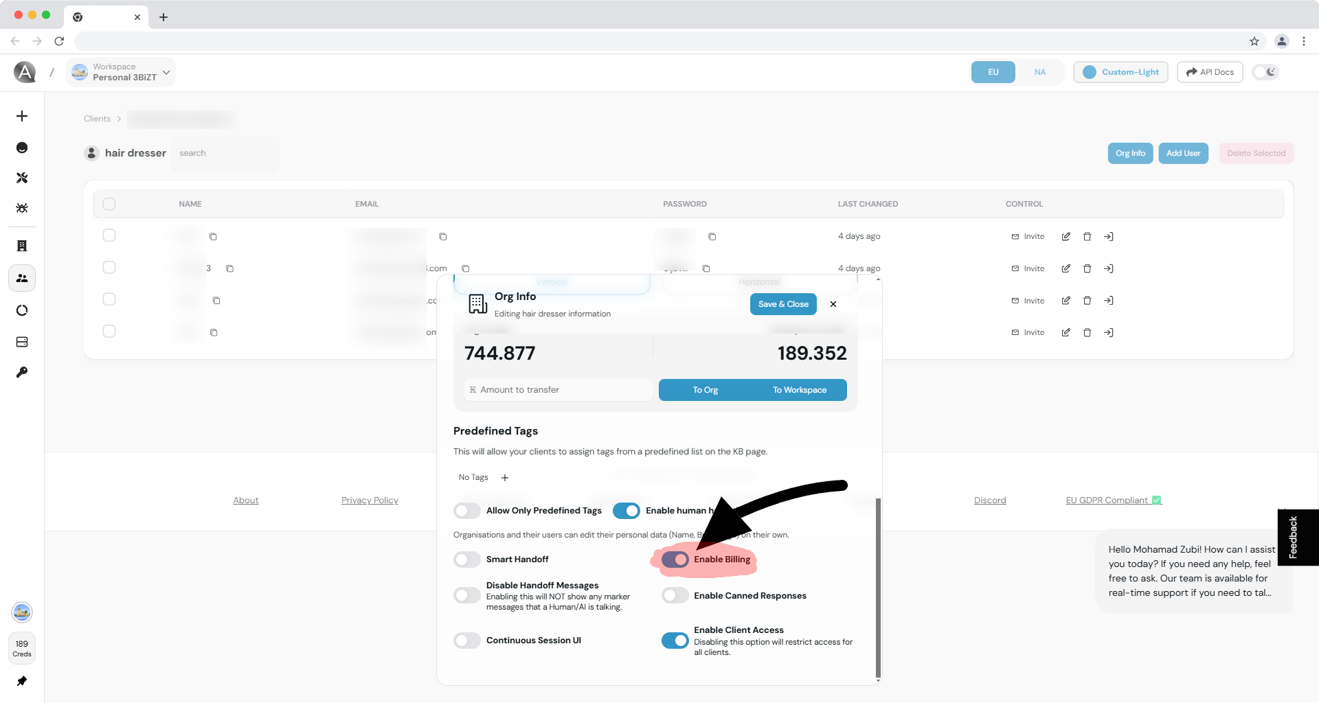 Once billing is enabled, clients can manage their payments and credits seamlessly through the integrated platform.
